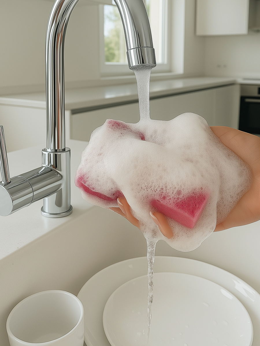 - Мягкий поролон бережно очищает посуду, хорошо пенится и впитывает воду