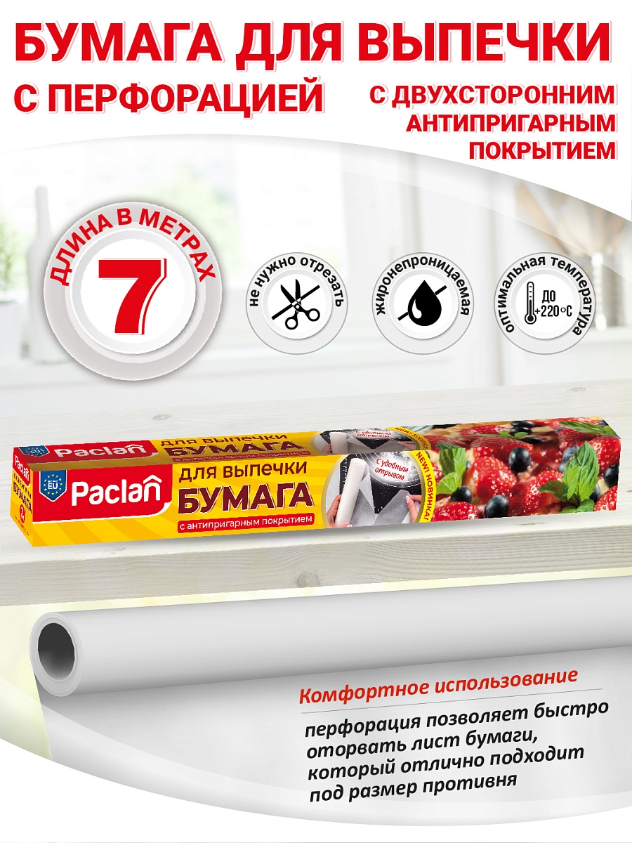 Бумага для выпечки Paclan с удобным отрывом по перфорации, белого цвета с двусторонним покрытием пищевым силиконом, предотвращает пригорание и прилипание выпекаемых изделий к противню и форме.