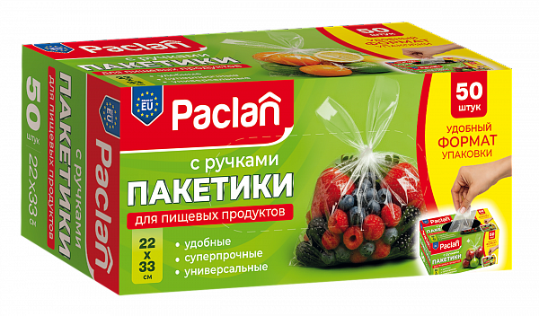 У пакетиков с ручками Paclan — обновление! Теперь они выпускаются в новой удобной компактной упаковке, которая занимает меньше места и оснащена специальным отверстием для легкого и быстрого извлечения пакетиков. Пакетики Paclan идеально подходят для хранения и упаковки пищевых продуктов. Они изготовлены из пищевого полиэтилена, безопасны и нетоксичны при контакте с продуктами. Материал обладает жиро- и водонепроницаемыми свойствами, помогает предотвращать высыхание и заветривание, сохраняя свежесть и аромат продуктов. Благодаря удобным ручкам пакетики комфортно переносить, а оптимальный размер делает их практичным решением для упаковки и хранения самых разных продуктов. Новая компактная упаковка — это еще больше удобства в повседневном использовании и привычное качество Paclan.