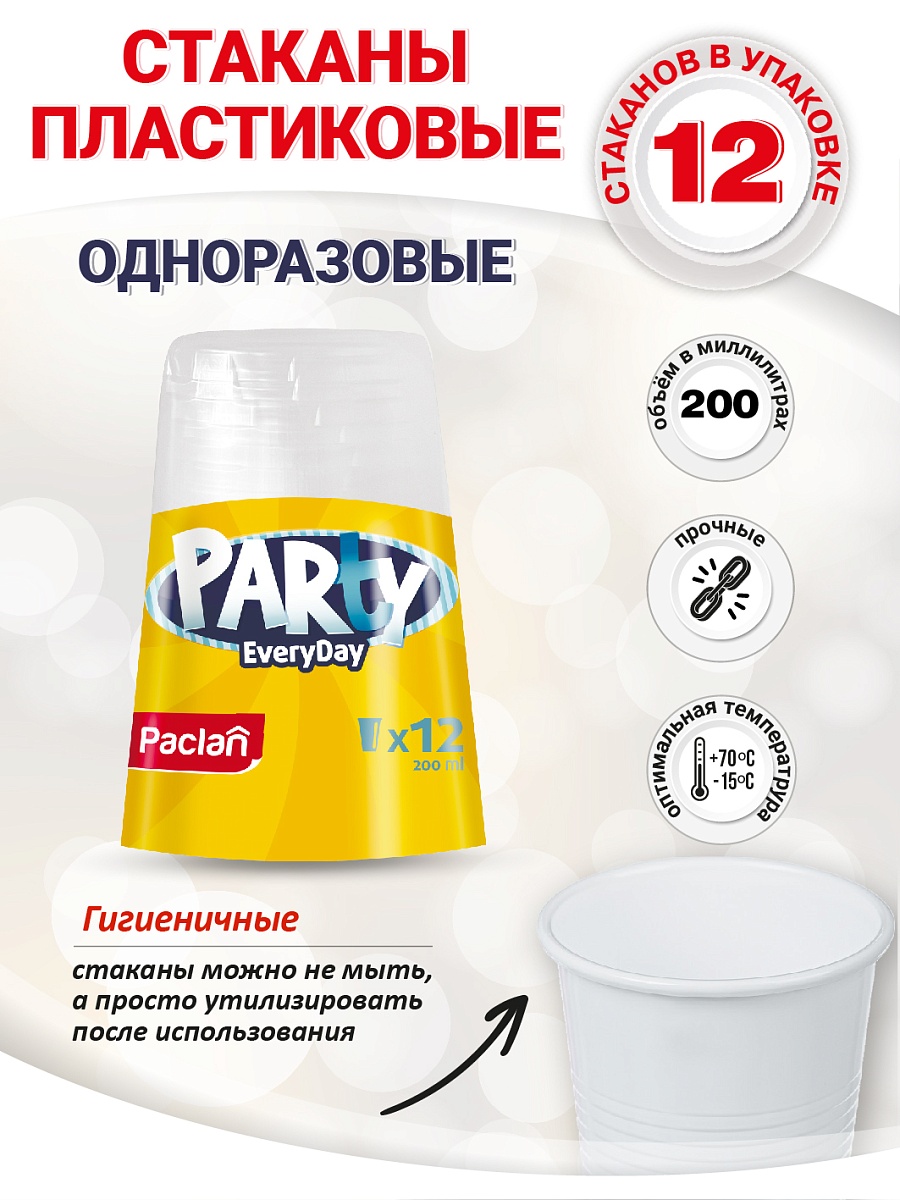 - Стаканы пластиковые Paclan Party Every Day, 200 мл, 12 шт.