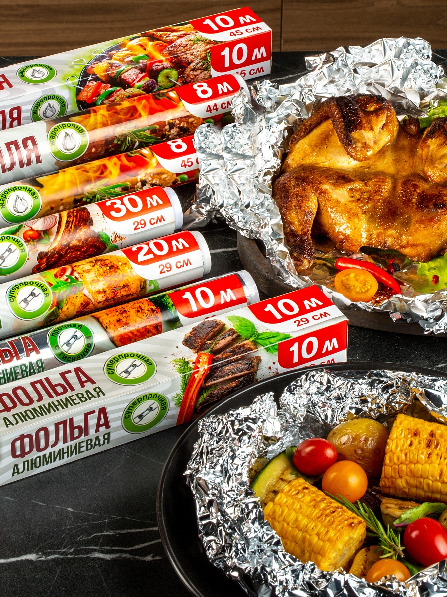 - Благодаря большой ширине фольги можно единовременно упаковывать и запекать большие порции блюд