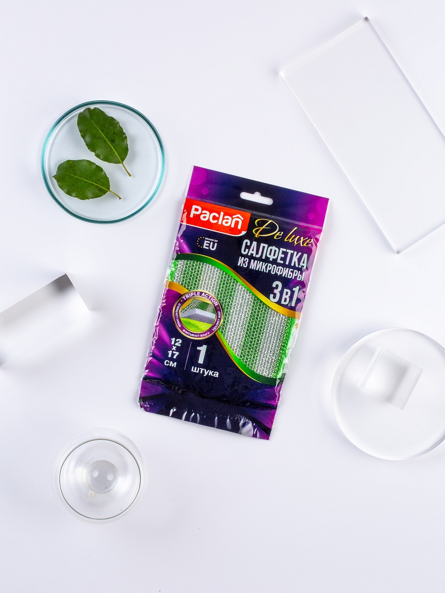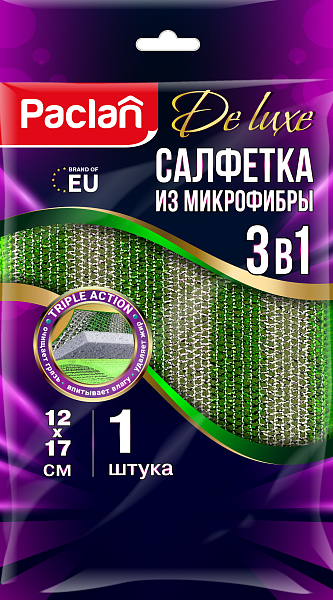 Салфетка из микрофибры Paclan De luxe 3 в 1 - состоит из 3-х слоёв, что позволяет сделать уборку более эффективной.